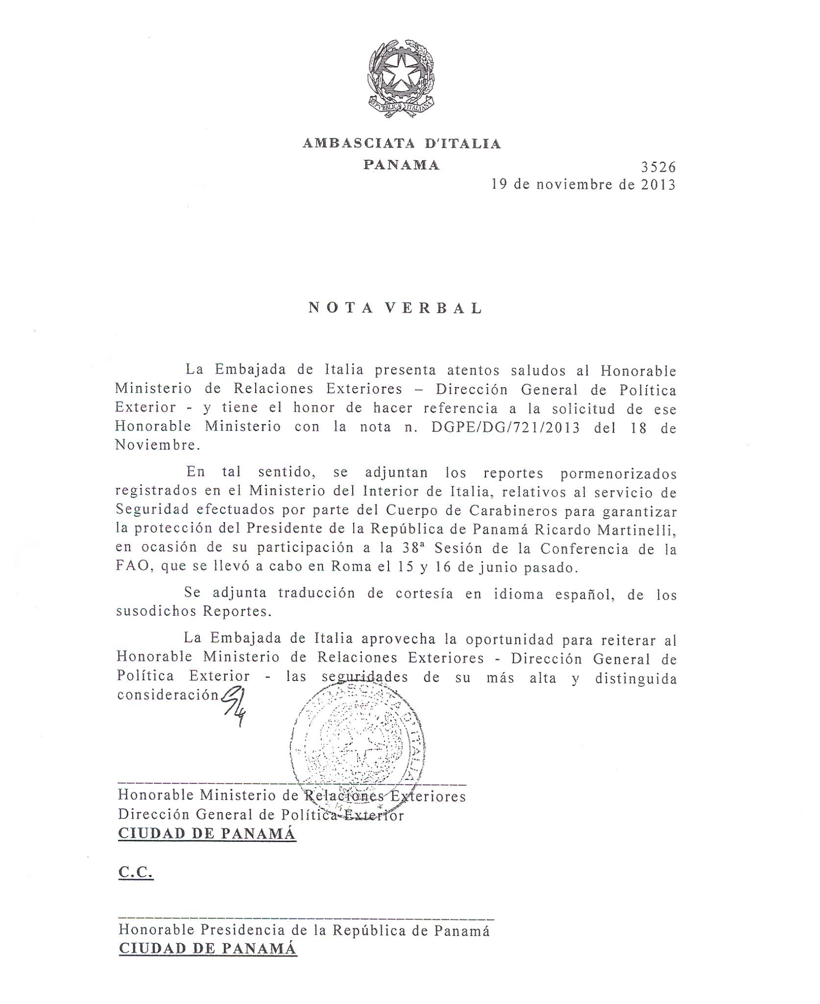 Un informe de la Embajada de Italia relata minuto a minuto los momentos desde que el presidente de la República, Ricardo Martinelli arribó a Roma y la seguridad que le brindó el Cuerpo de Carabineros cuando asistió a la 38 Sesión de la Conferencia de la FAO, que se realizó el 15 y 16 de junio pasado.